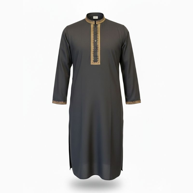 + Free ShippingThis Panjabi is a bold statement piece, combining the deep elegance of charcoal with a striking gold-toned contrast.